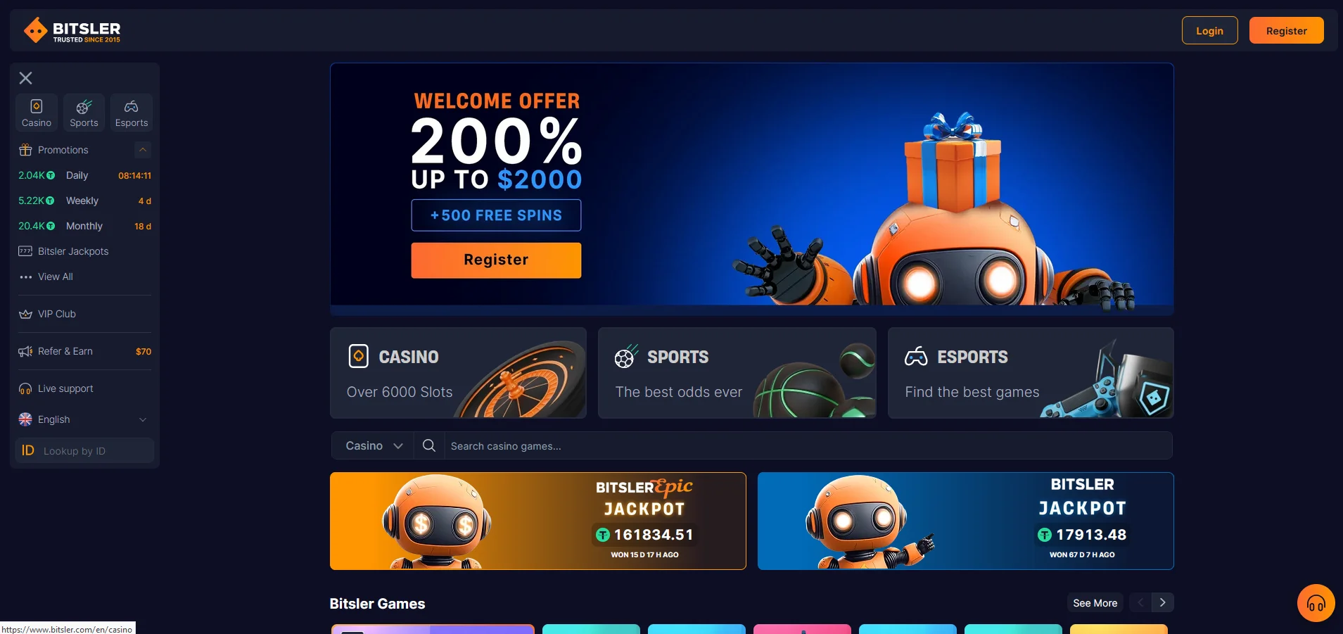 Bitsler is a crypto casino and sportsbook since 2015, with 30+ supported cryptocurrencies. The players also appreciate its provably fair games, fast on‑chain payouts, and great variety of games: slots, table games, and live games. The section called Bitsler Games enjoys such exclusive in‑house games as Dice, Plinko, Boom, Twist, and Mines to help gain XP rewards while rising through the VIP ladder.