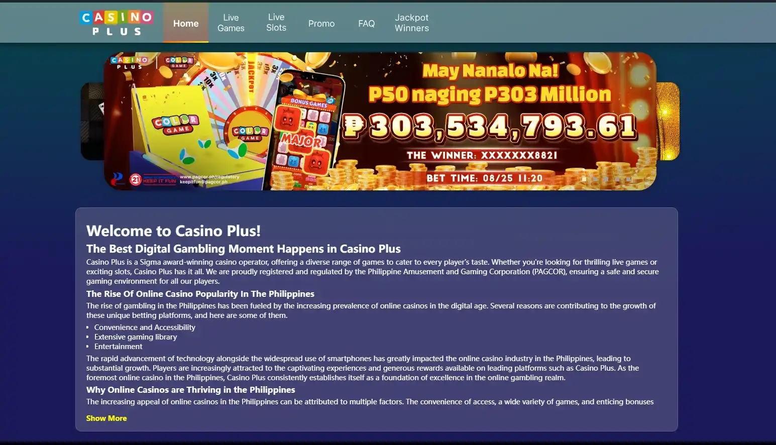 The Remote Gaming Platform (RGP) of Casino Plus allows players to access games on mobile or desktop devices, though only one device can be logged in at a time. Players must keep their account details secure, as any transaction made with their login information is considered authorized. Tampering with the gaming application is strictly prohibited. To play, users need to deposit at least Php5000, which will be locked for 60 days. Personal details for payments must comply with privacy laws. Deposits and withdrawals depend on processing times by partner financial institutions. Players can choose from a variety of games, and if disconnected, bets placed will still stand, with results processed accordingly.
